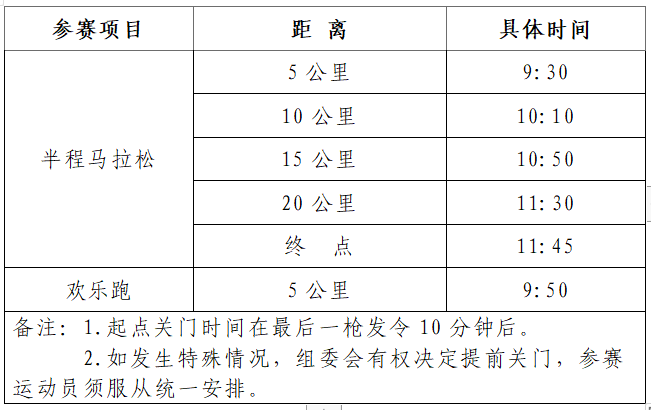 5.发令:按照竞赛项目采用分枪发令起跑办法。半程马拉松项目一枪,欢乐跑项目一枪。如果参赛者无效起跑,不会被叫停,裁判将取消其参赛资格。