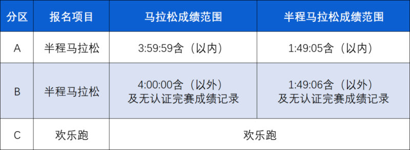 半程马拉松项目的分区依据为:报名运动员在中国马拉松信息平台上,2023年1月10日至2025年1月10日期间举办的认证级别为“A1 类赛事”的马拉松项目或半程马拉松项目的最好成绩。具体分区标准如下: