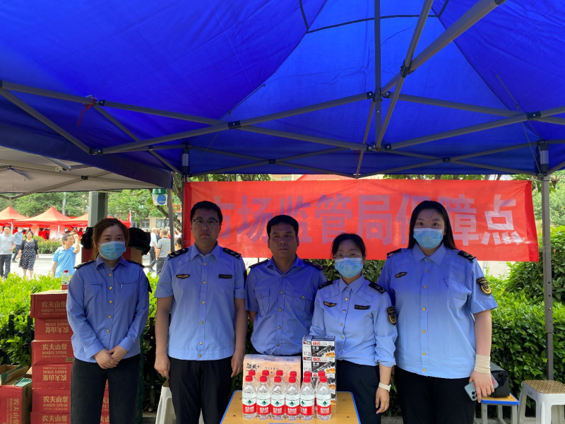 (沣东一校考点门口,市场监督管理局工作人员为考生及陪考家长提供饮用水和文具用品)