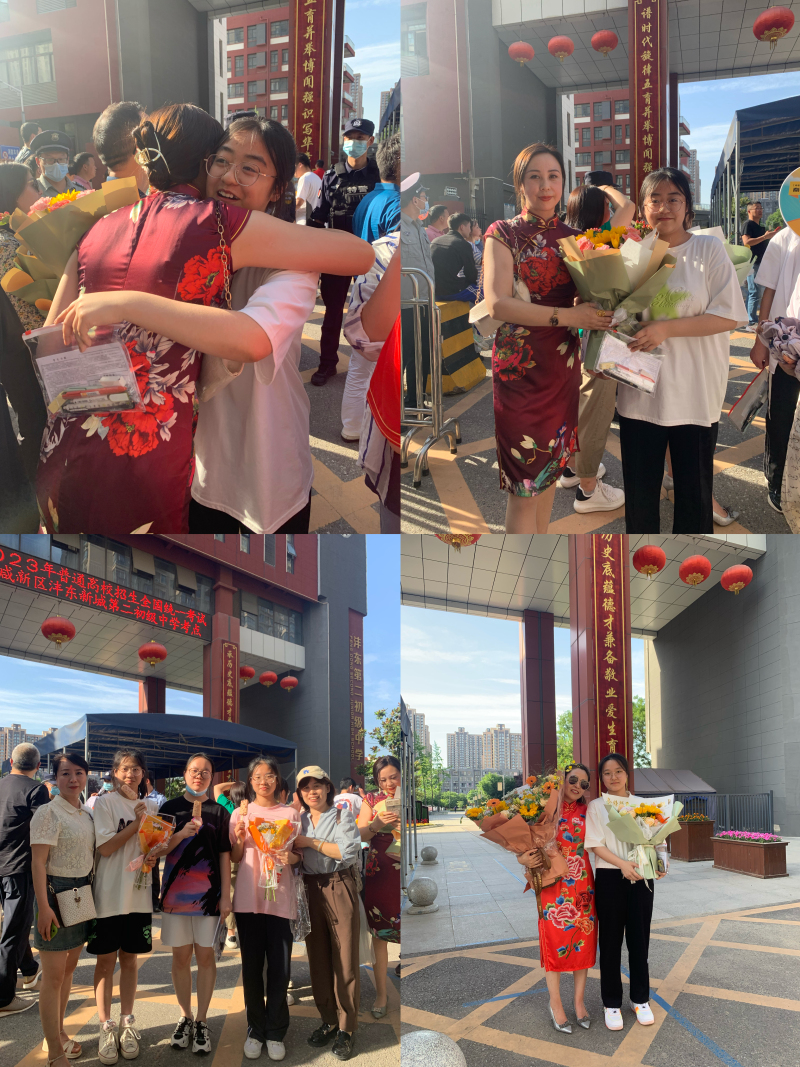 (沣东二中考点门口,最后一场考试结束,家长穿着旗袍迎接考生,寓意“旗开得胜”)