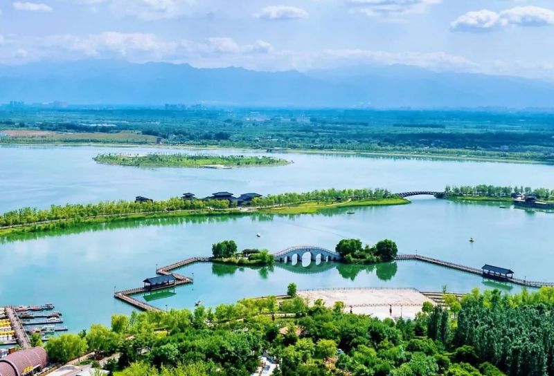 昆明池·七夕公园位于西咸新区沣东新城,地处西安城西的沣水、潏水之间,南眺秦岭,景色优美。唐代苏颋的诗句“画舸疾如飞,遥遥泛夕晖”不仅让古昆明池跃然纸上,也是如今昆明池的生动写照。