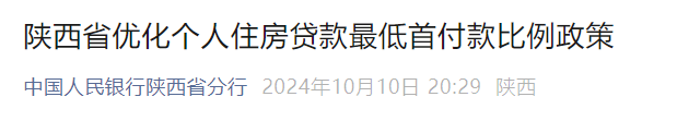 为贯彻落实党中央、国务院决策部署,支持城乡居民刚性和改善性住房需求,促进房地产市场平稳健康发展,根据《中国人民银行 国家金融监督管理总局关于优化个人住房贷款最低首付款比例政策的通知》要求和因城施策原则,结合陕西省各地市城市政府调控意愿,经陕西省市场利率定价自律机制会议审议通过,自2024年10月10日起,陕西省各城市商业性个人住房贷款不再区分首套、二套住房,最低首付款比例统一为不低于15%。