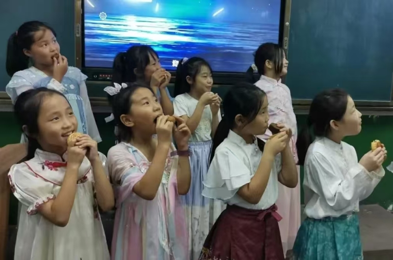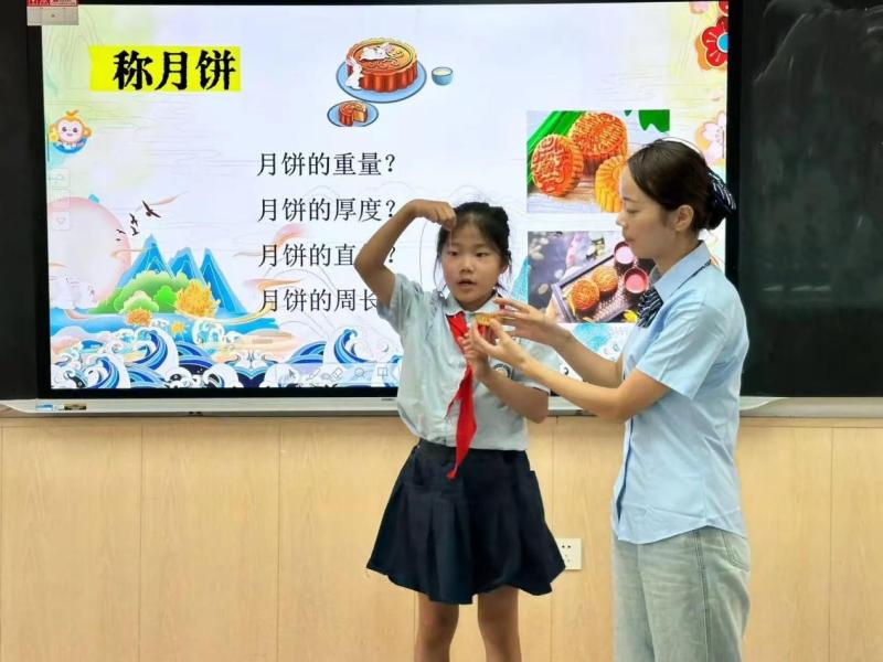 沣东一小精心准备了一堂以“月圆中秋,情满人间”为主题的综合实践课程,孩子们认真倾听老师讲述并且积极进行小组合作测量月饼的厚度、直径,观察月饼馅料以及练习“水调歌头”手势舞。一首首经典的中秋诗词,在孩子们稚嫩的声音中缓缓流淌。