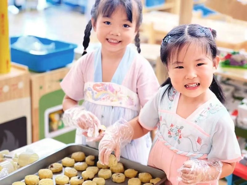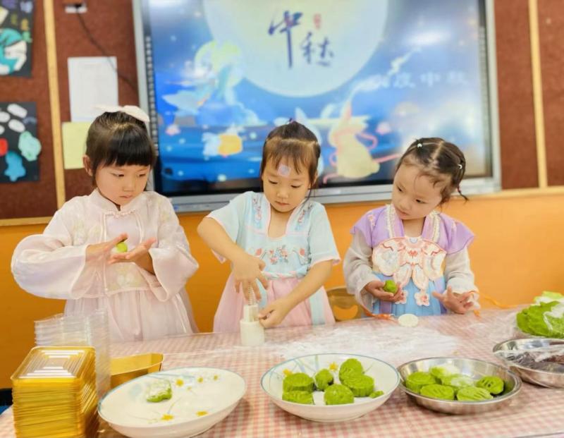 空港花园幼儿园孩子们和老师一起制作月饼,以这种特别的方式让孩子们感受节日的欢乐气氛。
