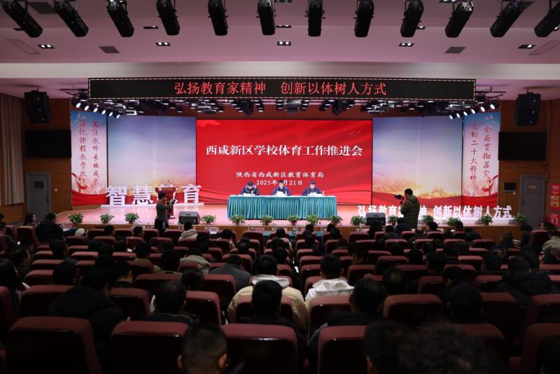 2月21日下午,西咸新区校园体育专题会在沣西实验学校召开。新区教育体育局主要领导、分管领导,相关业务部、各新城工作部负责人,全区中小学校长及体育教研组长,新区篮球协会、足球协会、羽毛球协会、武术协会负责人等350余人参加会议。
