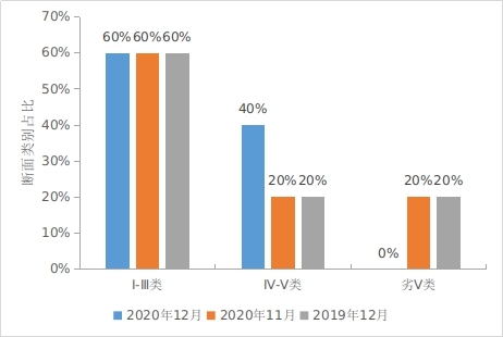 12月份,5个省控断面中,Ⅰ—Ⅲ类水质断面3个,占60%;Ⅳ-Ⅴ类2个,占40%。与去年同期相比,Ⅳ-Ⅴ类水质断面类别占比提高20个百分点,劣Ⅴ类下降20个百分点。与11月份相比,Ⅳ-Ⅴ类水质断面类别占比提高20个百分点;劣Ⅴ类下降20个百分点。