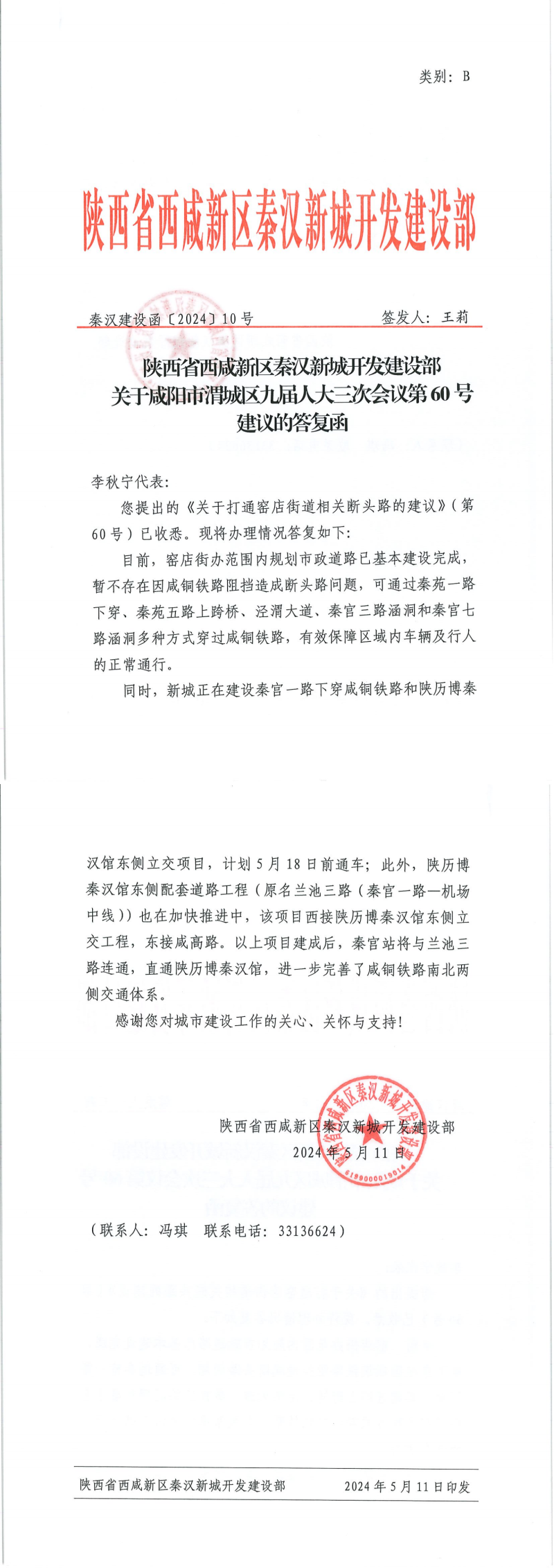关于咸阳市渭城区九届人大三次会议第60号建议的答复函