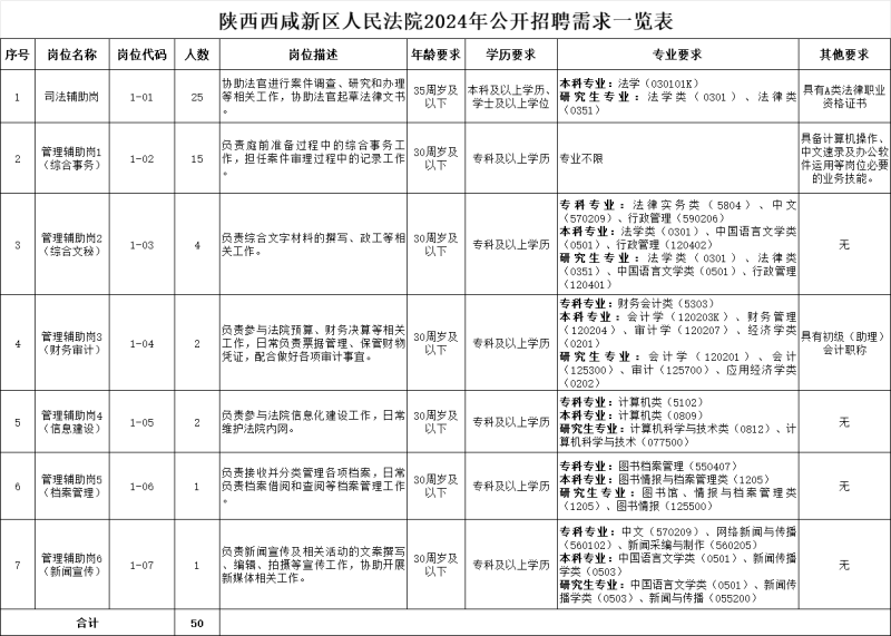 陕西西咸新区人民法院2024年公开招聘需求一览表