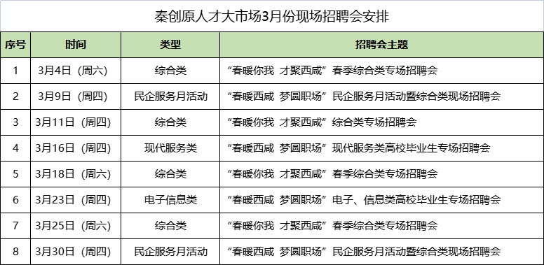 为进一步做好稳就业工作,服务企业人才需求促进群众家门口就业,秦创原人才大市场还将在3月份举办多场专题招聘会,欢迎大家积极报名参与。