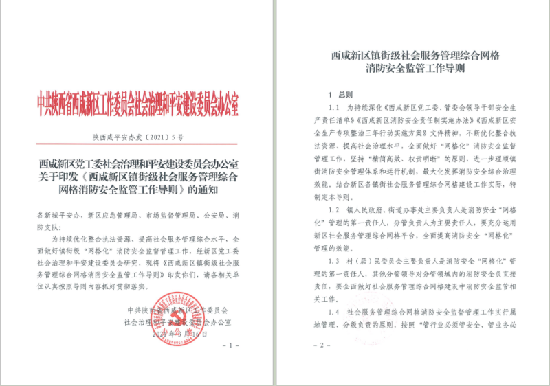 为持续优化提升社会服务管理综合水平,全面做好镇街级“网格化”消防安全监督管理工作,西咸新区坚持“精简高效、权责明晰”的原则,制定出台了《镇街级社会服务管理综合网格消防安全监管工作导则》。