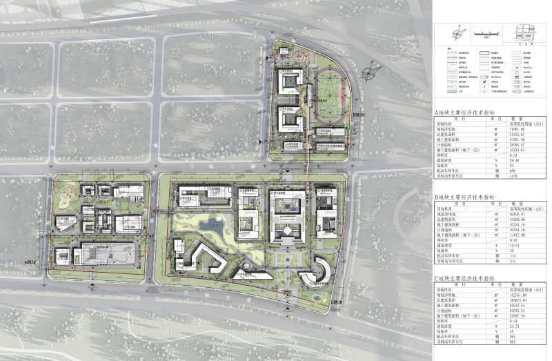 项目概况:该项目位于西咸新区秦汉新城秦宫六路以东、兰启路以南、秦宫八路以西、兰池大道以北区域,由三个地块组成。其中A地块规划净用地面积71801.00㎡,规划总建筑面积51325.67㎡;B地块规划净用地面积63836.97㎡,规划总建筑面积54359.06㎡;C地块规划净用地面积152551.00㎡,规划总建筑面积105672.93㎡,主要建设教学楼、图书馆、宿舍等,该方案设计经文物部门审查同意。详见总平面示意图。