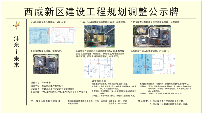 根据西安市自然资源和规划局《关于加强建设工程规划条件核实管理工作的通知》,现将沣东i未来项目规划许可内容调整予以公示。批前公示并非最终审批结果,在公示期内,利害关系人若有意见,可来电向西咸新区自然资源和规划局(沣东)工作部、开发建设部反映。