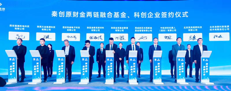 秦创原财金两链融合基金分别与北京清泰科新能源技术有限责任公司、北京亮亮视野科技有限公司、中航创世机器人(西安)有限公司、陕西迪泰克新材料有限公司、西安锐磁电子科技有限公司、陕西天焱能源科技有限公司、西安嘉瀚机电科技有限公司7家企业签署合作协议,将充分发挥省属金融机构的引领作用与基金资本招商功能,催化牵引优质科技成果加速产业化。